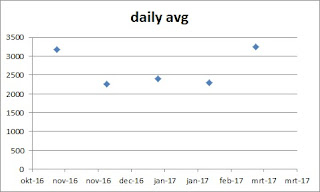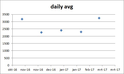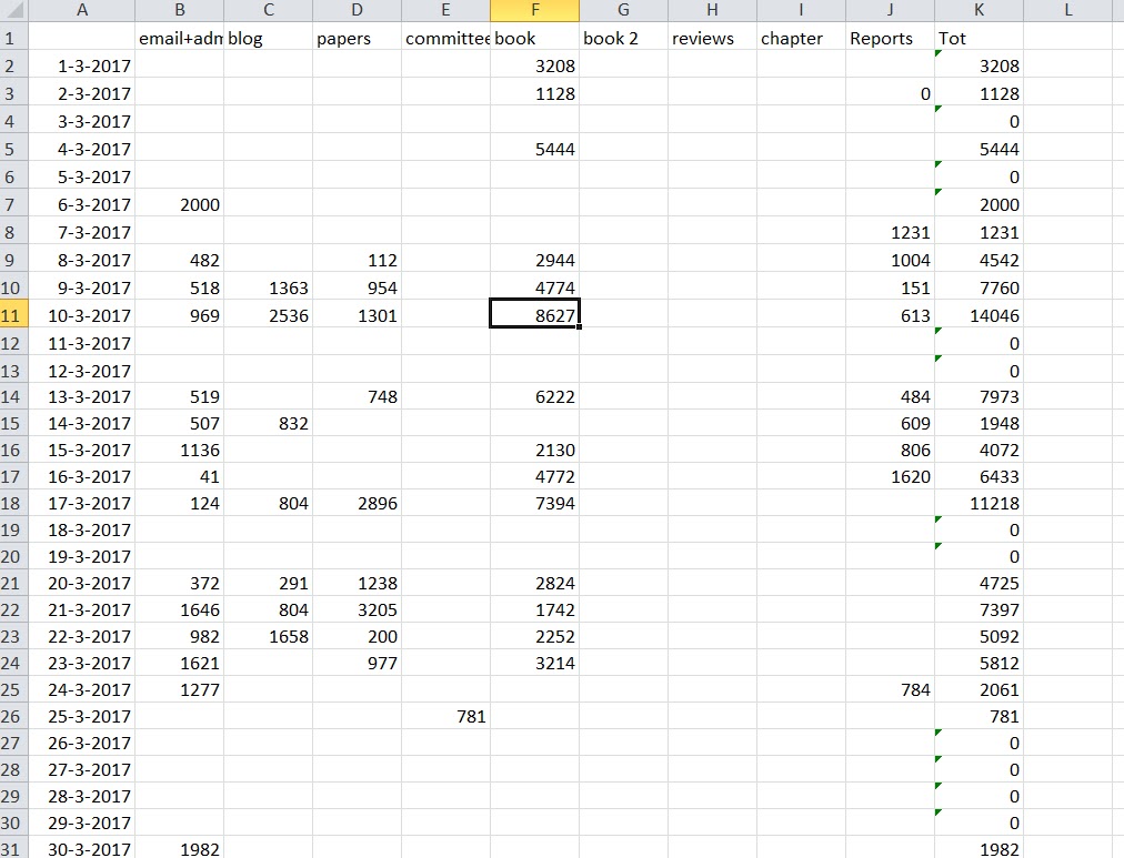 In total, since tracking my words (between November 2016 and April 2017, upon writing of this post), I have written 455767 words. My writing has been productive, since I am drafting two book projects. I average 2675 words a day, also taking into account the days on which I don’t write (weekends, conferences). This word count will drop down drastically as I start to revise and edit what I wrote before.