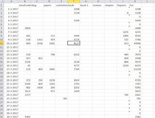 […] meeting with PhD candidate x or working on the literature review section of paper Y). In addition, I track the words that I write on a daily basis, as well as the number of emails in my mailbox in the morning, at the end of the day, and the […]