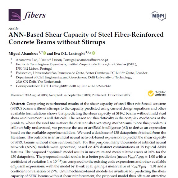 For the year 2019, Miguel Abambres and I won a Collaboration Grant from USFQ. The first paper from this collaboration is titled “ANN-Based Shear Capacity of Steel Fiber-Reinforced Concrete Beams without Stirrups”. It’s open access and published in the journal fibers. You can read the paper here.